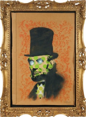 Two of only three known versions painted in 2008, his pictures of Abe Lincoln show Banksy confronting and disrupting another icon—one of the most famous Presidents of the United States of America. In these pictures, Banksy has taken the famed face of “Honest Abe” and transformed him into a ghoulish, comical presence. In one of them, googly eyes appear to pop out of his head as though from a skull; in the other, there is a spectral halo around the eyes, as though they were glowing. These potentially sinister traits are deliberately undermined by the stenciled decoration behind him, and in one case, by the green polka dots that cover his face and shirt.