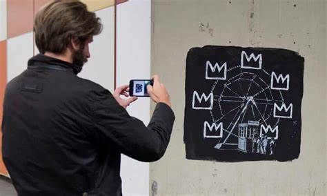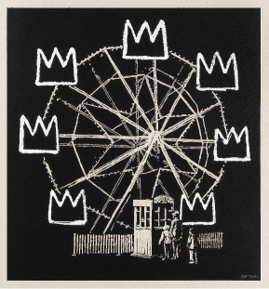In this homage to Basquiat, Banksy offers a mirror to his own practice of appropriation as well as that of the endless wheel of capitalism and consumerism in which masterpieces are massively reproduced on tee shirts or rehashed for advertising campaigns.