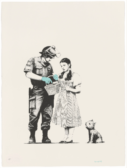 With this work Banksy once again states his disdain for the police, continuing a recurring theme present in his oeuvre since the early 90s. Policemen takes center stage in Rude Copper, which features a policemen giving the viewer the finger; and Stop and Search, in which a policeman rifles through Dorothy from The Wizard of Oz’s wicker basket. but also in Flying Copper and so many versions of it representing heavily geared law enforcement officers with smiley faces.