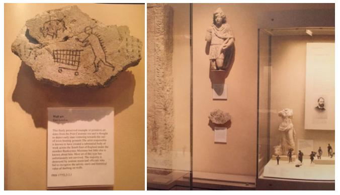 In May 2005, Banksy installed a piece of concrete in the British Museum’s Roman Britain Gallery. The concrete piece depicted a crudely drawn, primitive caveman with a shopping cart in the foreground and a buffalo that has been wounded by two arrows in the background.