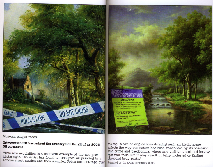On this occasion he placed his painting, Crimewatch UK Has Ruined the Countryside For All of Us, a serene, peaceful looking landscape covered with police tape. After a few hours the painting crashed to the floor and the stunt was discovered.