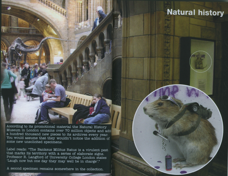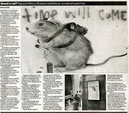 On 7 April 2004, Banksy entered the Natural History Museum disguised as an employee, carrying a taxidermied rat in a glass-fronted box.