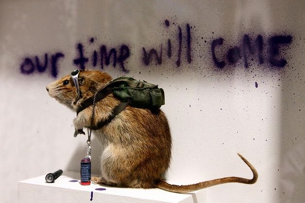 The rat wears sunglasses and a complete graffiti kit. Apparently, he has sprayed “Our time will come” on the wall behind him. The installation came with a printed explanation titled “Pest Control.” A few years later, Banksy set up his own certification office naming it “Pest Control Office.”