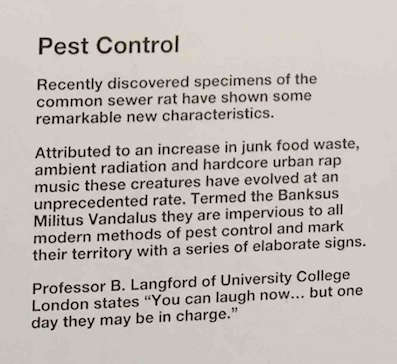 On 7 April 2004, Banksy entered the Natural History Museum disguised as an employee, carrying a taxidermied rat in a glass-fronted box.