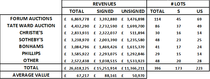 In terms of price segmentation, 227 prints sold for under GBP 50,000 for a total value of GBP 8,124,050. However, only 25 prints sold under GBP 25,000 for a cumulative value of GBP 555,921. The lowest price was GBP 16,380 for Weston Super Mare (unsigned).