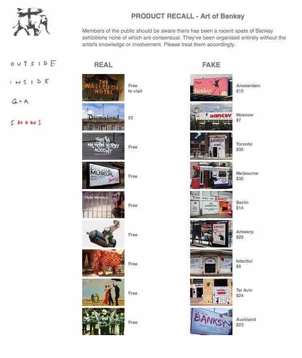 In September 2018, in response to the preponderance of “Banksy exhibitions” organized all over the world, the artist added a new section to his website entitled “Product Recall.” He did this in order to make clear to the public that many Banksy exhibitions had been organized “entirely without the artist’s knowledge or involvement” – as a way to clearly draw a clear line in the sand between his work and those who attempt to leverage his status and/or work without his involvement. As outlined in the image below, Banksy has made all of his exhibits free to the public (with the sole exception being Dismaland – and even that was merely £3).
