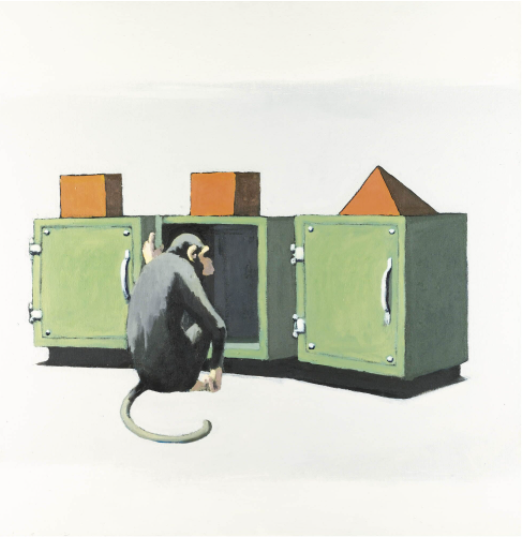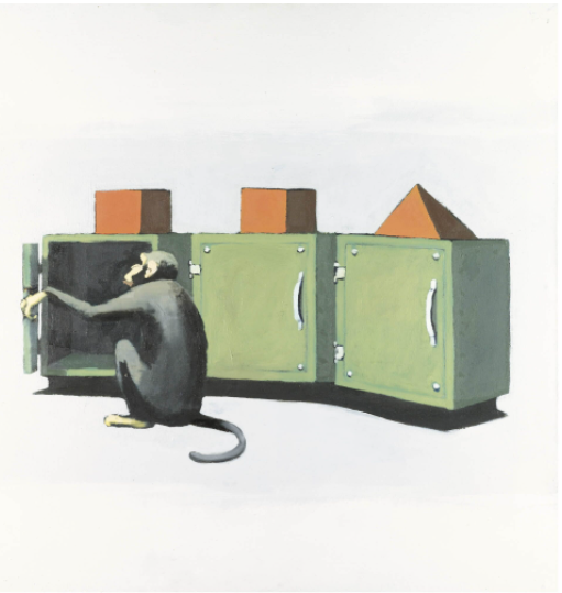 , made of 5 parts painted on canvases, tells the story of a chimpanzee undergoing an intelligence testing and opening safes in order to find the prize – in this case, a hand of bananas.