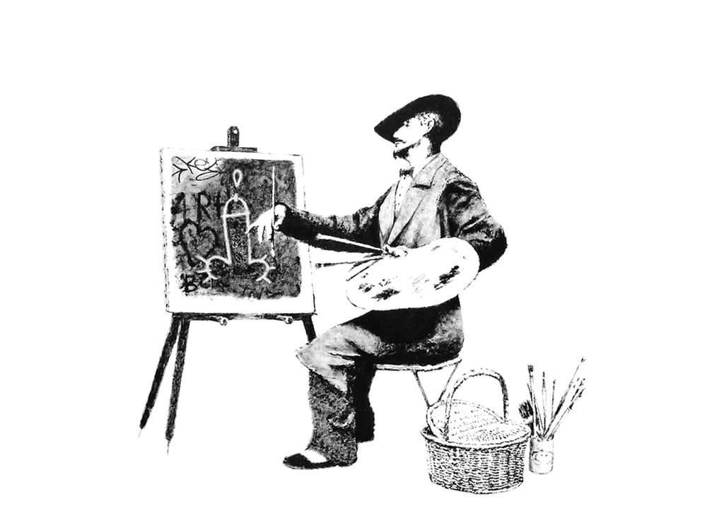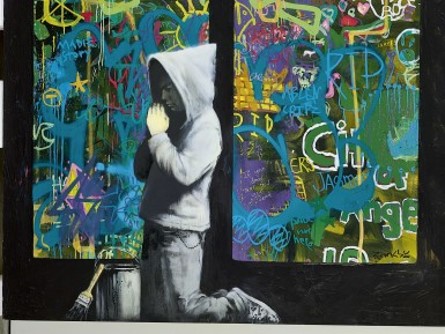 While the widely recognizable image of the kneeling boy, accompanied by the title Forgive Us Our Trespassing, first appeared in 2010, the present 7-meter work was created in 2011. Making the piece even more interesting is the fact that more than one hundred 6th-9th grade students at the City of Angels School in Los Angeles contributed to the work. The project was aimed to encourage children to create art – showing us yet again that Banksy’s heart is always in the right place. The students assisted in tagging the stained-glass windows, Forgive Us Our Trespassing goes to the very heart of the spirit of street art and graffiti. The imagery itself, on the other hand, is a potent and moving revelation of Banksy’s conflicted feelings about being a graffiti artist, speaking to deep preoccupations and pathos that underscore his artistic production.