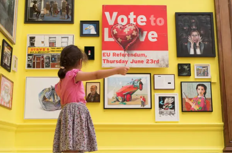 The composition depicts a red, heart-shaped balloon, patched up with crisscrossed plasters, which has drifted in front of the placard’s slogan, altering the word “LEAVE” to “LOVE”. With its striking simplicity and raw immediacy, Vote to Love offers a message of optimism at a time of increasing divisiveness in global politics.