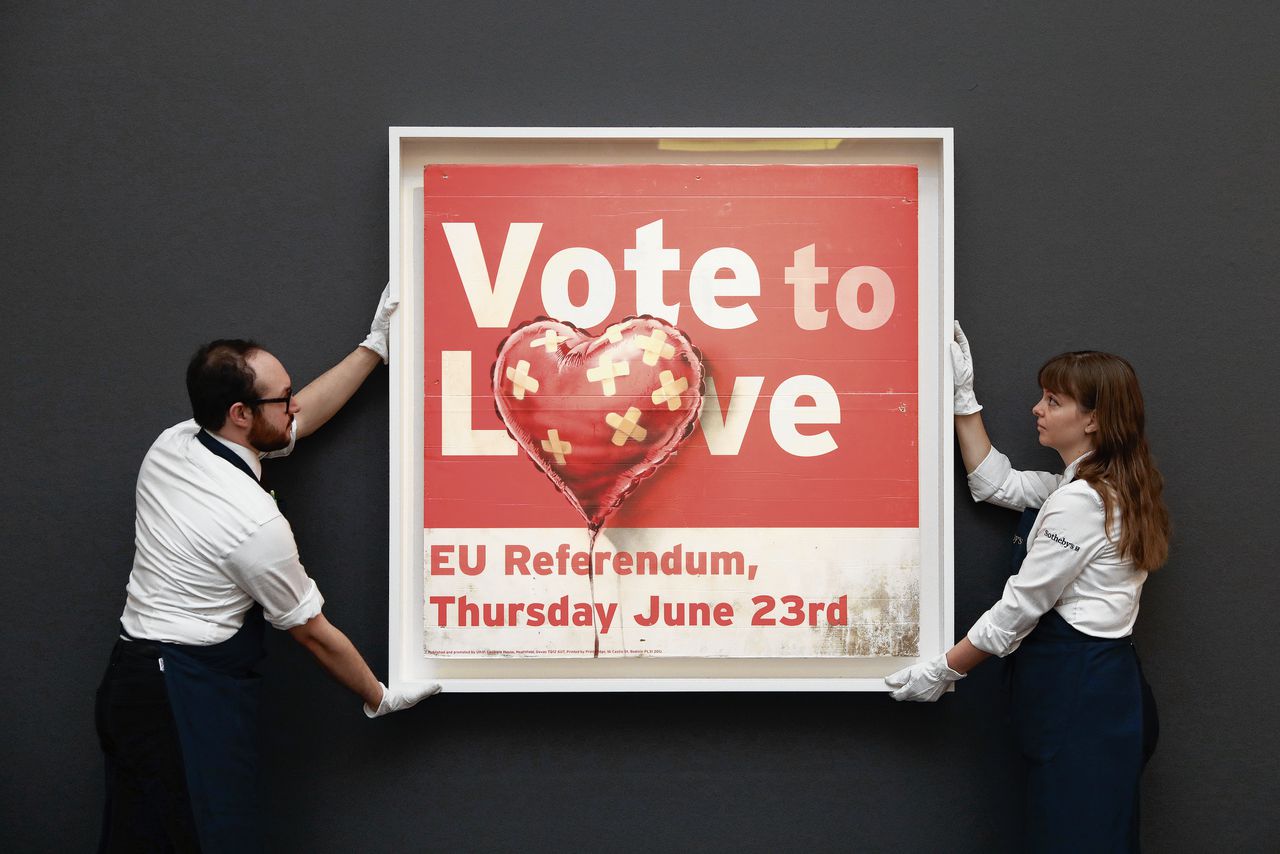 Executed in 2018, Vote to Love is a subversive painting from the anonymous street artist’s seditious and politically charged oeuvre. To create the work, Banksy defaced a found “Vote to Leave” placard from the UK’s 2016 Brexit campaign, led by UKIP’s then-leader, Nigel Farage.
