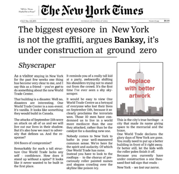 ‘In October of 2013, Banksy became Artist in Residence for the City of New York. An honor so prestigious, he made it up and awarded it to himself!’