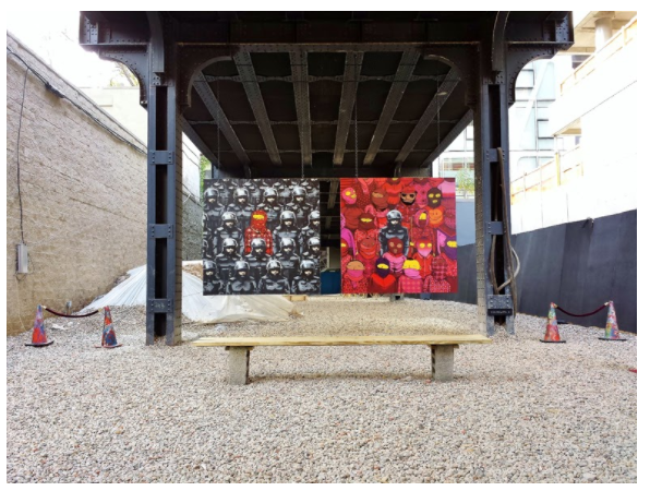 Hammer Boy appeared on the outer wall of a DSW on 79th street and Broadway, on Upper West Side in Manhattan. This mural is a perfect example of a site specific work in which the artist has repurposed some basic and ugly urban pipes and signs into an artwork which becomes part of the urban landscape. Indeed some city spaces are not restricted to their prescribed use, and objects can be elevated to the aesthetics of art and be fun for the viewer.