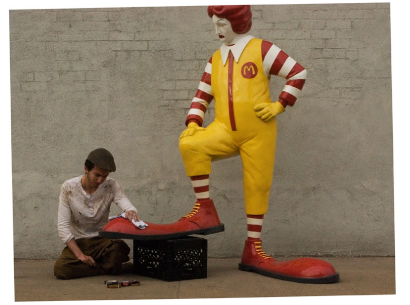 A fiberglass replica of Ronald McDonald having his shoes shined by a real live boy. The sculpture visited the sidewalk outside a different McDonalds every lunchtime for a week. The boy looks downtrodden, dirty, and tired while wearing tattered clothing as Ronald McDonald looks down in a disapproving manner with one hand on his hip.
