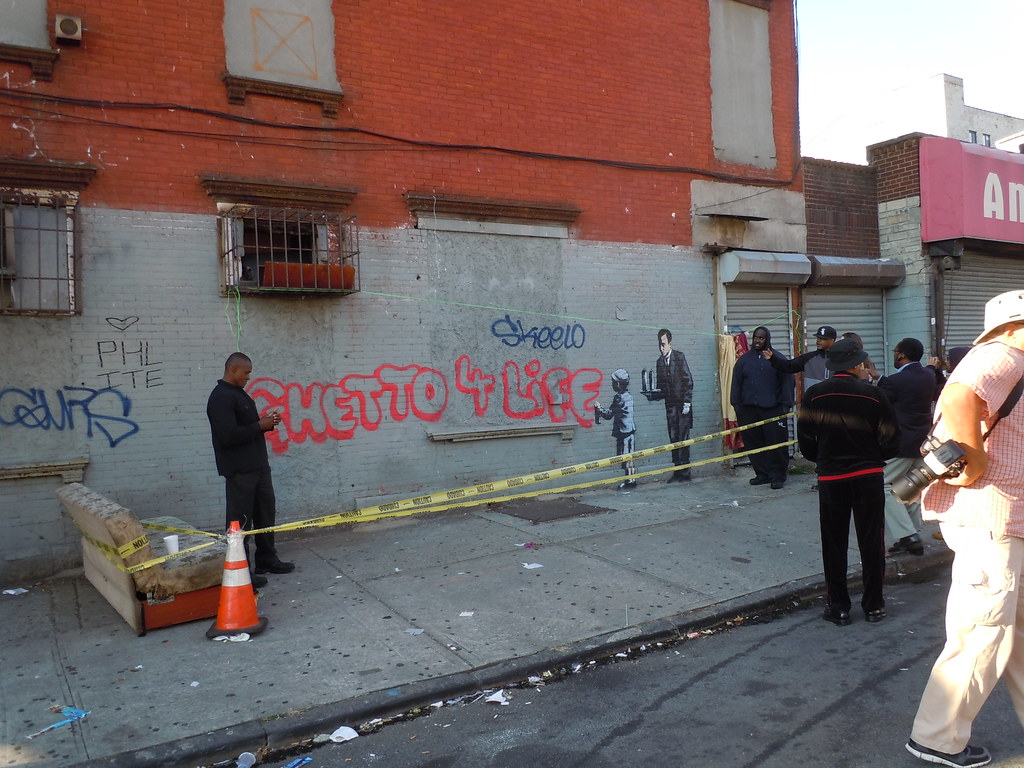 Maybe more than any other mural, it ignited a vivid debate over the word “Ghetto.” As always the case with Banksy, the location is big part of the message – as this mural appeared in South Bronx, and it provoked strong reaction from locals. Sustainable South Bronx may have sold t-shirts that say “Green the ghetto,” and others who live or work in the South Bronx may sometimes refer to their neighborhoods as “the ghetto” but many didn’t like hearing that word from a white artist with no Bronx roots.