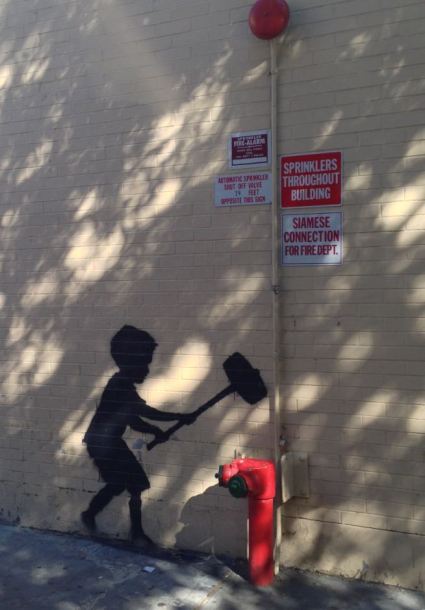 Hammer Boy depicts a boy holding a hammer, in the process of striking a red fire hydrant, which has a pipe coming up through the top leading to the fire alarm.