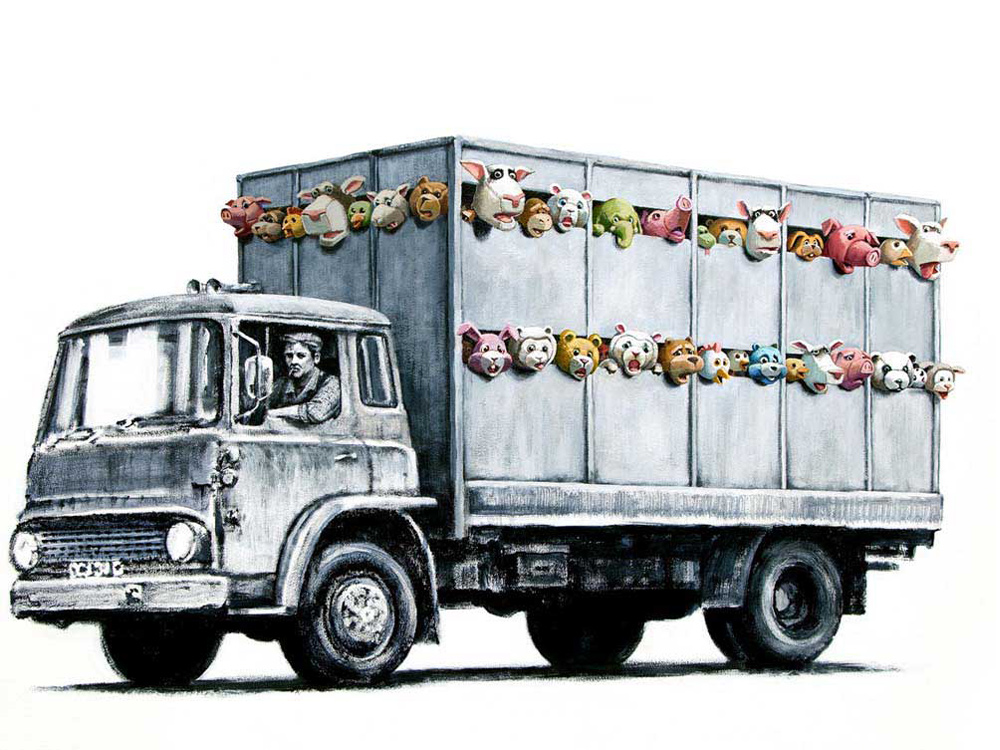 A slaughterhouse delivery truck is carrying 60 stuffed animals (cows, chickens, pigs, lambs, pandas, etc.) who are seen moving their heads through wooden slats. The animals can also be heard squealing and banging their head against the slats. Sirens of the Lambs toured the streets of New York for two weeks.