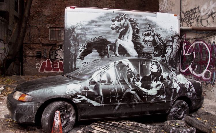 The fleeting, temporal nature of Banksy’s art is part of its appeal. A new piece each day in New York “turns the city into a giant game of treasure hunt.” Each work is a precious commodity that can and almost certainly will disappear within hours. Banksy wants them to be discovered in alleys next to dumpsters, not displayed in a sterile museum.