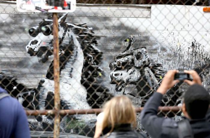 This installation is most probably the most political and innovative piece created by Banksy during his New York residency. It presents a complex visual dynamic with armed men in gun sights, horses wearing night vision goggles, together with a free phone number to hear the audio of an air strike.