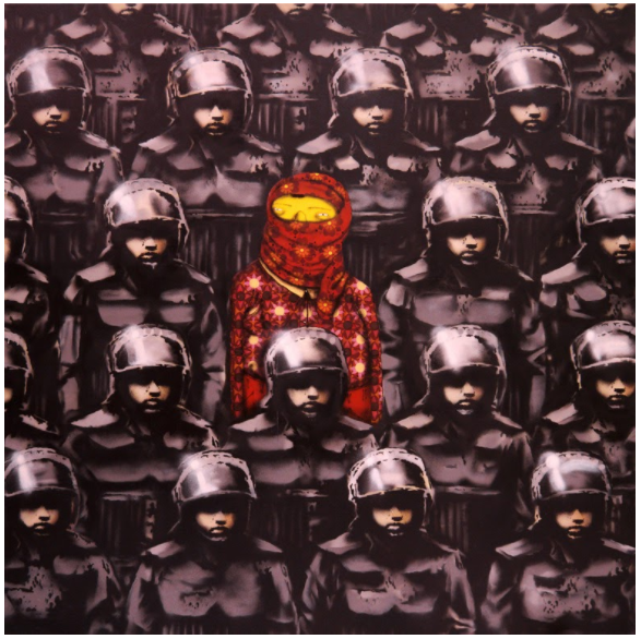 Ghetto For Life appeared in South Bronx, New-York, on October 22. This typical Banksy mural portrays a young boy working on a graffiti slogan saying “Ghetto 4 Life”. The striking part of the visual is the way this young boy is dressed, which does not appear consistent with what one thinks a young boy from the ghetto would dress, and on top of that, it seems he is accompanied with a butler ready to serve some kind of refreshments.