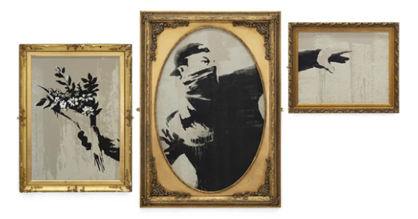 Painted in 2020, Bunch of Flowers is a reinterpretation of one of the artist’s most iconic images. In this specific work, Banksy has stenciled a bouquet of flowers whose wrapping evanesces against the opaque acetate ground; it is a unique work and the gilded frame was selected by the artist. The cropped composition recalls the artist’s recurrent Love is in the Air or Flower Thrower motif, an image which first appeared in Jerusalem shortly after the West Bank Wall was constructed in 2000. Here, however, the focus rests on the blossoms of the ‘Flower Thrower,’ who hurls not stones or a Molotov Cocktail, but flowers in his quest for peace.