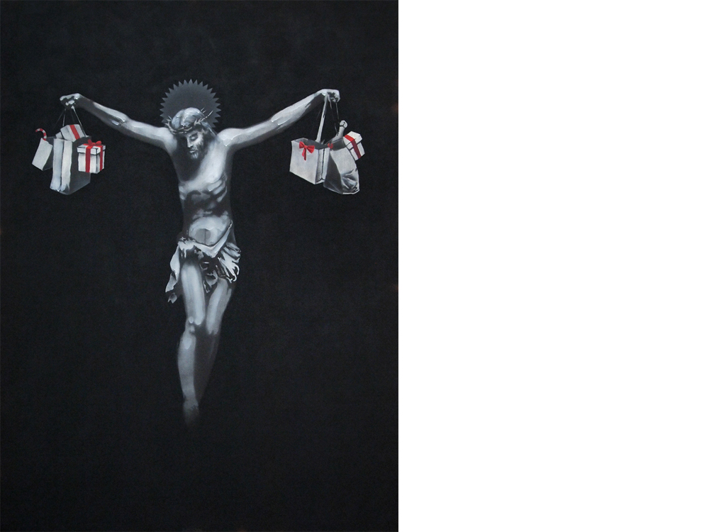 Christ with Shopping Bags, also known as CWSB, portrays the crucifixion of Jesus Christ, yet Banksy has removed the structure of the cross from the iconic scene. Jesus Christ is holding shopping bags, carefully wrapped with red ribbons, and seeping with black blood. The viewer can glimpse Christmas presents such as candy cane and Mickey Mouse. The image is undoubtedly meant as a satire on modern commercialism, pointing a finger at the hypocrisy of modern celebration.