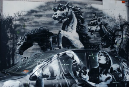 A distinguishing feature of this new piece is that no part of it is actually on a wall: it is rendered on the sides of an abandoned car and of truck, adding impressive visual depth.