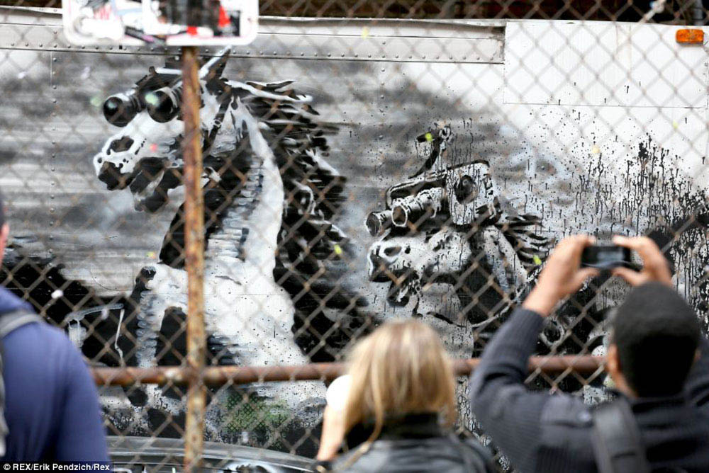 This installation is most probably the most political and innovative piece created by Banksy during his New-York residency. It presents a complex visual dynamic with armed men in gun sights, horses wearing night vision goggles, together with a free phone number to hear the audio of an air strike…