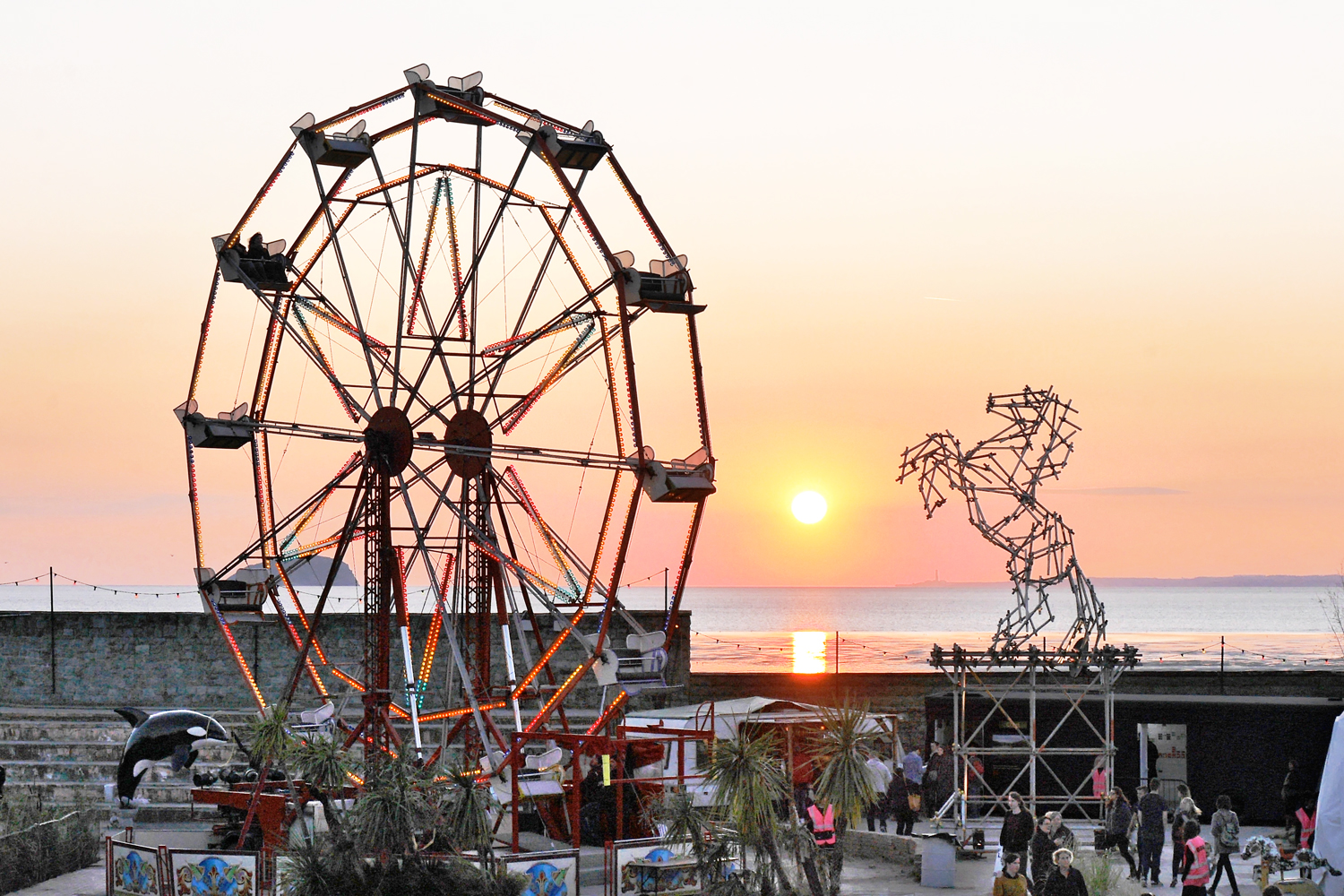 Several large artistic structures were displayed at Dismaland: a large Ferris Wheel by Banksy, Horse Scaffolding Sculpture by Ben Long, a twisted truck sculpture, and Big Rig Jig by artist Mike Ross which was previously shown at Burning Man in 2007.