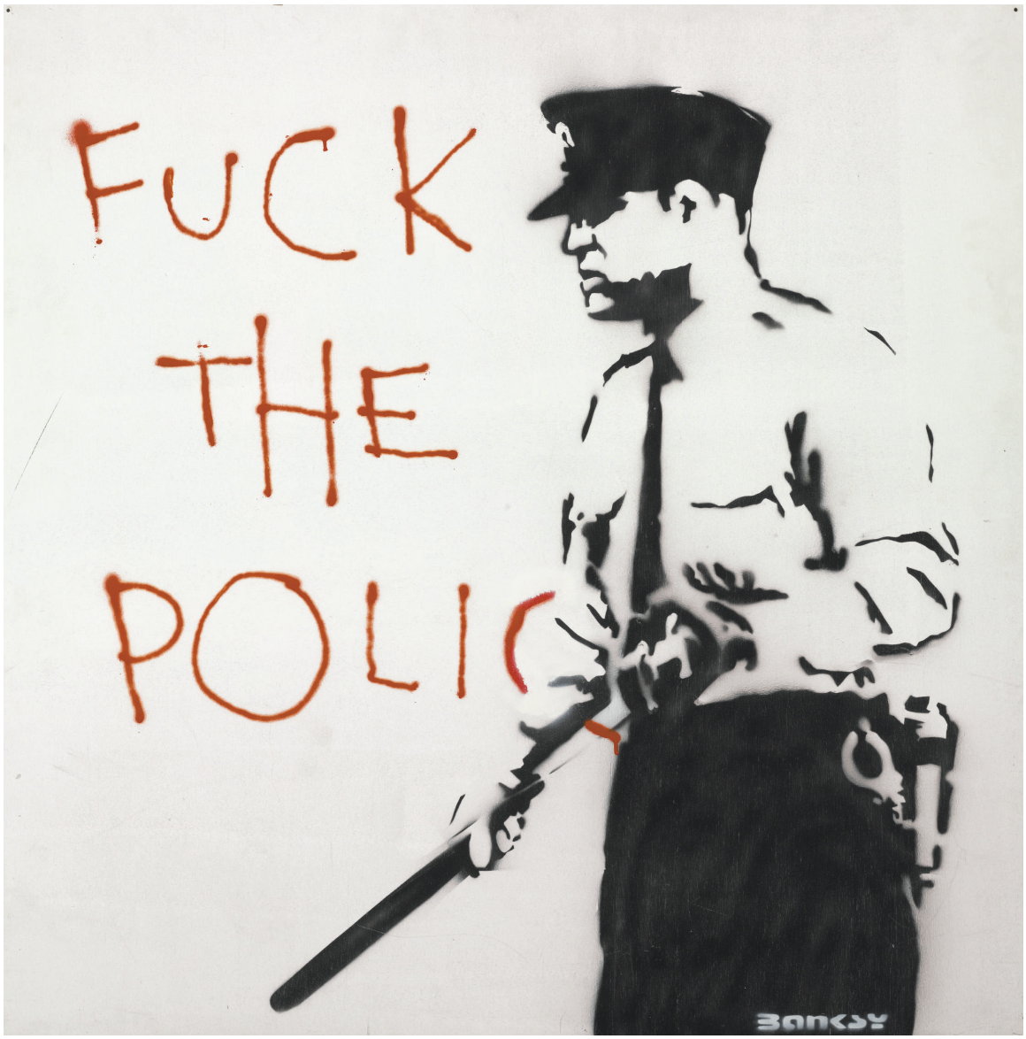 Untitled (Fuck the Police) from 2000 is a striking, early example of what was to become one of Banksy’s most iconic motifs. Banksy’s relationship with law enforcement is understandably difficult and the theme spreads throughout his career, most famously in 2005 with The Kissing Coppers on the wall of the Prince Albert Pub in Brighton and the Snorting Copper in London’s East End.