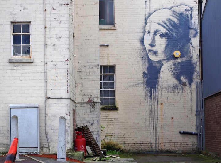 Of course, in true Banksy style, there’s something a little off about the piece. The pearl earring (and the entire earlobe) has been replaced with an alarm box (from ADT). The piece can been seen on a building at the Albion Dockyard in Hanover Place.