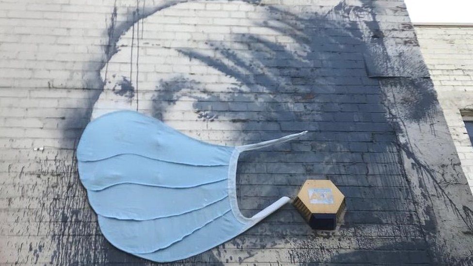 In April 2020, Girl with Pierced Eardrum has been given a mask similar to those worn by NHS staff and key workers during the crisis. It is not known who put it on the wall.