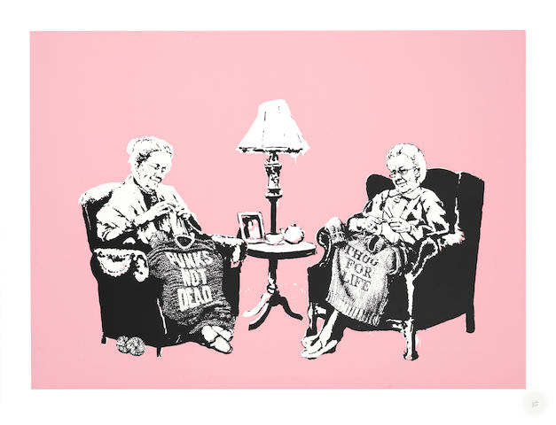 Rendered in Banksy’s signature black and white stencil style, the pair is set against a block pink background, which juxtaposition serves to heighten the humorous contradiction between scene and message, a technique mastered by the artist. As it is often the case in Banksy’s works, several interpretations are possible. Perhaps this artwork reminds the viewer never to underestimate the relatively innocuous appearance of the older generation, which acts as a guise for their rebellious pasts.