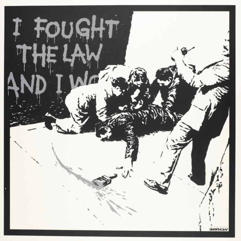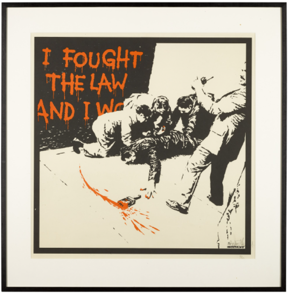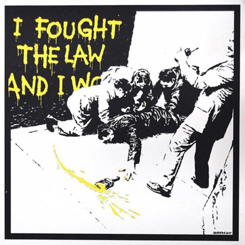 I Fought the Law, also known as IFTL, is based on a video footage of John Hinckley’s 1981 failed assassination attempt on U.S. President Ronald Reagan. In a violent struggle, one man is being pinned. The man on the ground has dropped a paintbrush, with which he has just scrawled the words “I Fought The Law And I Won” in bright orange paint on the wall behind. In Banksy’s version, the criminal is a graffiti artist, instead of a killer.