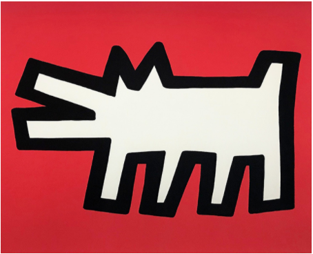 The dog’s simple, cartoonish shape references Haring’s interest in Egyptian hieroglyphics -how humans from that time communicated their experiences through universal shapes and signs. Haring’s “Barking Dogs” can be found throughout his career, from some of his earliest Subway Drawings, to merchandise sold in his Pop Shops.
