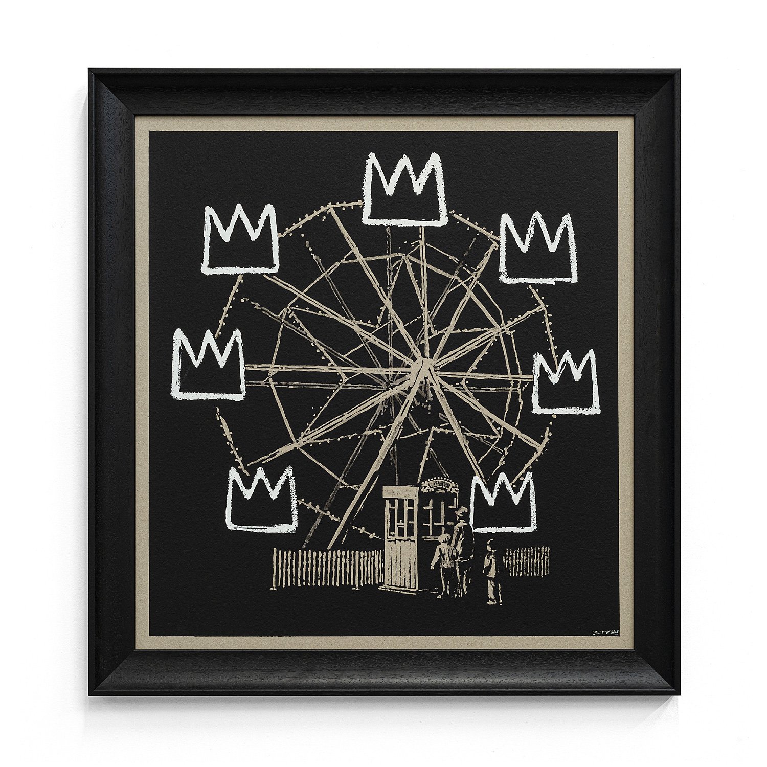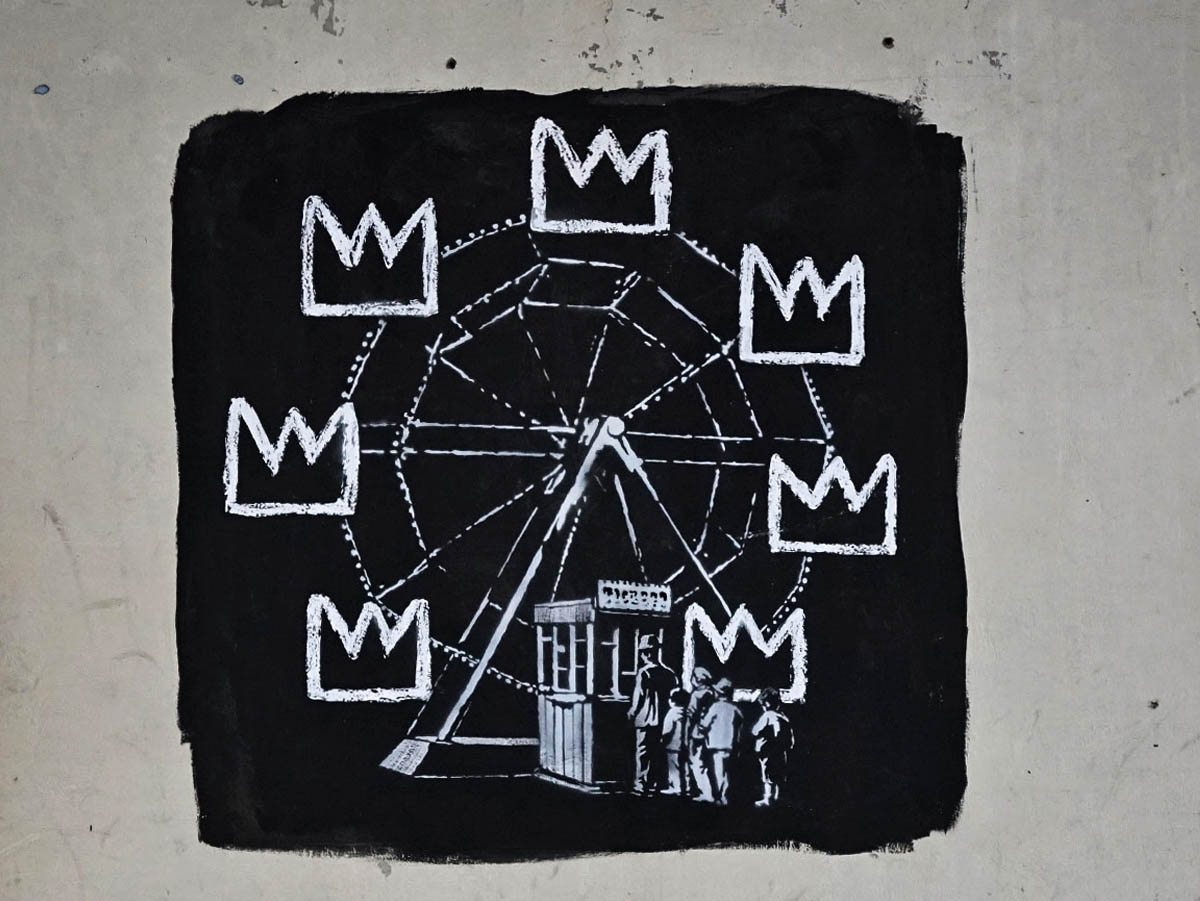 Banksquiat depicts a Ferris wheel in which all the carriages have been replaced by Basquiat’s famous crown motif. By referencing Basquiat so openly, Banksy seems to be aligning himself with the tradition of street art as high art, which arguably has its origins in the work of Basquiat whose career was launched by his many interventions in the urban environment. Banksy makes further reference to street art history by choosing to print his design in grey with the crowns outlined in a chalky white against a black ground. This clearly refers to another icon of street, Keith Haring, who started his career with a series of subway drawings, rendered in chalk on empty advertising panels in the New York Metro system.