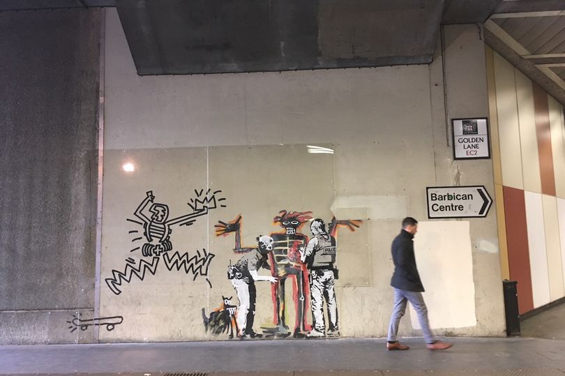 “Portrait of Basquiat being welcomed by the Metropolitan police – an (unofficial) collaboration with the new Basquiat show.” portrays two police officers strip-searching a figure as the dog looks on. It is largely inspired by Basquiat’s famous 1982 painting Boy and Dog in a Johnnypump.
