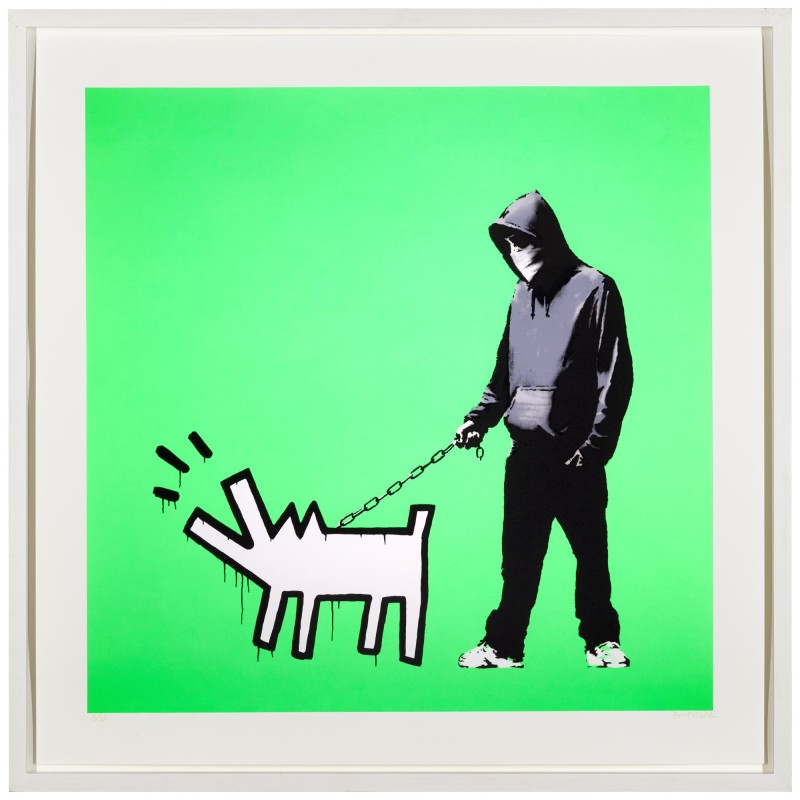 In Choose Your Weapon, Banksy portrays British disaffected youth and gang culture whose aggressive dogs have become weaponry in their quest for power. The minimalist animal, painted in a hieroglyphic all-white silhouette, pays tribute to Haring’s famous Barking Dog. Maybe Banksy invites us to “Choose Our Weapon” for peace and freedom. Like Banksy, Haring too rose to prominence through his street art, making him an important influence for Banksy. Indeed, one can also see this work as an illustration of the artist’s power in using his art and talent to convey messages.