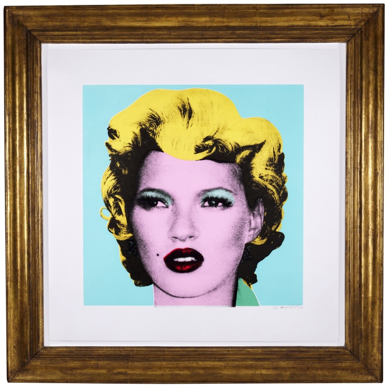 In his Kate Moss, Banksy again pays homage to Andy Warhol’s iconic Marilyn Monroe suite, both in its subject and its formal execution. Banksy combines the features of Moss and Monroe, superimposing Monroe’s hair onto a grey-scale portrait of Moss, then staining it with vibrant colors. Warhol’s portraits of Monroe, like many of his other works, were both a glorification of fame and a satirical comment on it as a spectacle. Kate Moss has been described as one of the most recognizable faces of her time (perhaps Banksy’s generation’s Marilyn Monroe), appearing on over 300 magazine covers and featuring in Time Magazine’s list of the world’s “100 most influential people” in 2007. She contributed to the history of fashion for 25 years, and her image became part of global popular culture.