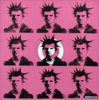 This artwork is clearly inspired by Warhols Marilyn Diptych, showing Monroe’s portrait in a repetition of 25 screen prints on canvas. In Banksy’s version, the glamorous Marilyn is replaced by the notorious bass guitarist and singer of the Punk band Sex Pistols. Banksy presents a satire of the values associated with the Punk movement, such as anti-establishment views, anti-commercialism, and individualism since Pop Art, on the other hand, is interlinked with notions of popular culture, consumerism, and the mainstream.