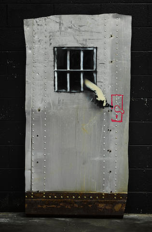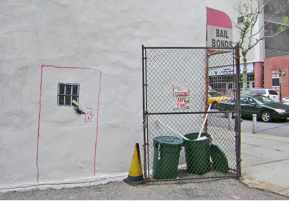 The stencil for Jail Break made its public appearance in 2010 on the side of an unassuming Bail Bonds building in New York. The addition of Banksy‘s artwork, positioned where one might imagine a back door to appear, gives the work the visual immediacy and humor that we have come to expect from the artist.