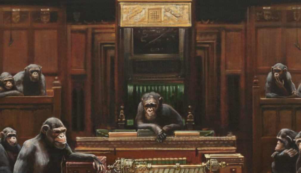 From the earliest Monkey Detonator through to works that directly mock the establishment, notably the ambitious dystopian reimagining of the House of Commons run amok with irate chimps (Devolved Parliament, 2009), primates are Banksy’s most frequently called-upon symbol, as a means through which to mock and challenge perceived authority and the establishment. Indeed, the figure of the chimpanzee has remained central in the decades succeeding its inception. Considering Banksy’s mature practice, author Patrick Potter has stated, “These images can be really arresting at their best. They’ve evolved from the kind of cartoonish carnival of Banksy’s animal army to controlled irony, designed to reveal the foolishness hidden in plain view in our society’s values” (Patrick Potter, Banksy: You are an acceptable level of threat and if you were not you would know about it, Durham 2012, n.p.).