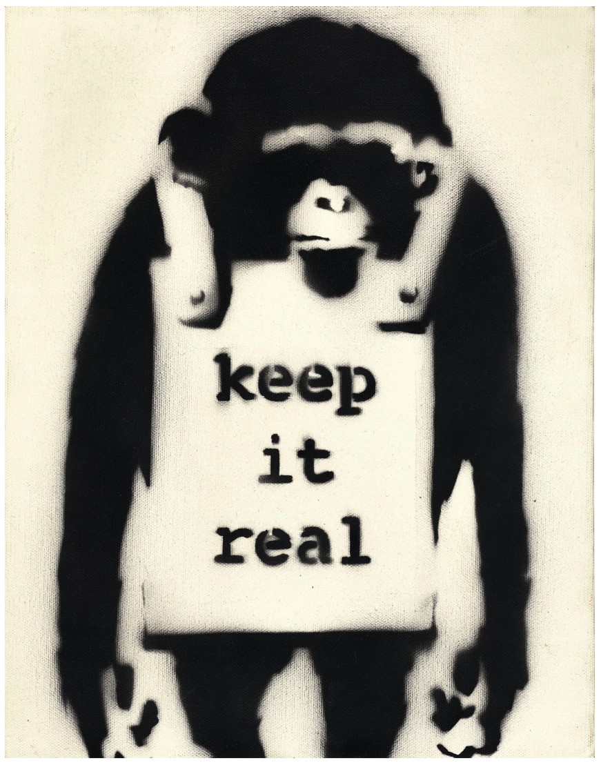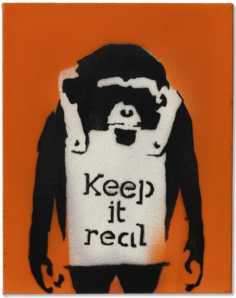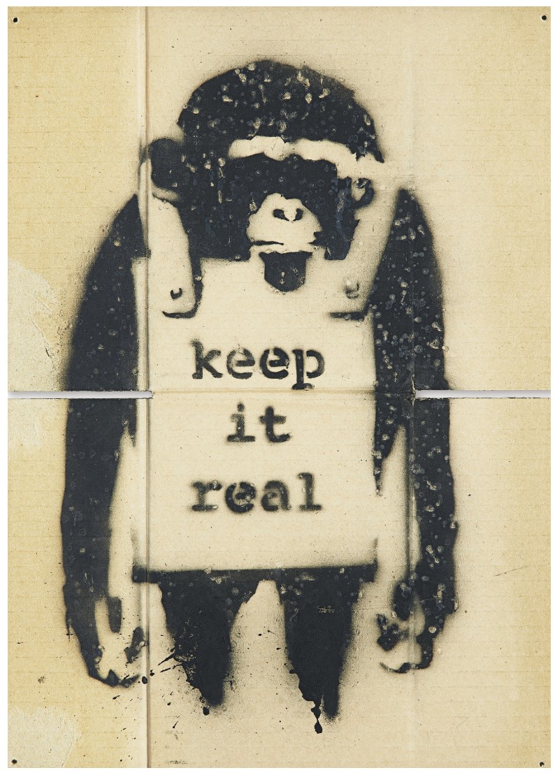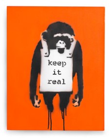 Keep It Real features one of Banksy‘s most iconic and popular images, the chimpanzee appearing here in one of its many incarnations as the loveable underdog with a sandwich board, underestimated and yet subversive, with the power to illicit social transformation. Standing upright like a human being with their signature look of slouched shoulders and downturned eyes, Banksy‘s monkeys often popped up overnight on streets, walls and bridges of cities throughout the world. The text written on their boards are often times political and social commentary coming from the artist. As with a large number of the artist’s recurring stencils this image has appeared at auction on many occasions in many media.