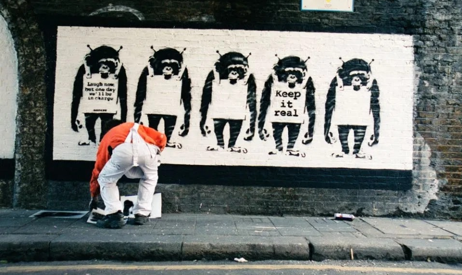 From its first iteration, Banksy has mobilized the figure of the monkey with all its Darwinian associations of docility, inferiority and intellectual simplicity, as the perfect visual representation of the subordination of the masses. In this light, Keep it Real, can be understood as a critique of the authoritarian manipulation of the working class, despondent and suppressed under the forces of capitalism. Conversely Banksy’s chimpanzees, rather than inhabiting a purely docile existence, may also be seen as deviant and mischievous clever characters. It is through this duality of association, that the monkey has taken center stage in Banksy’s practice as one of the most widely recognizable motifs in the artist’s arsenal through which to represent both the dejected and disillusioned masses and the authoritarian figures of the establishment.