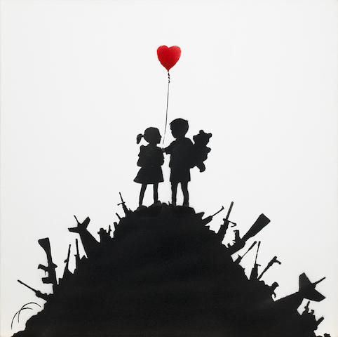 The viewer is immediately moved by the silhouettes of a young boy and a girl on top of a mountain made out of weapons. As they look at one another, she holds her red heart balloon as he holds a teddy bear. The appear to be find comfort and safety within each other, and there is hope that perhaps if adults could tap into and embracing the innocence and love children innately have for others, we might be able to overcome the current state of affairs that are marked by war, hatred, violence, and oppression.