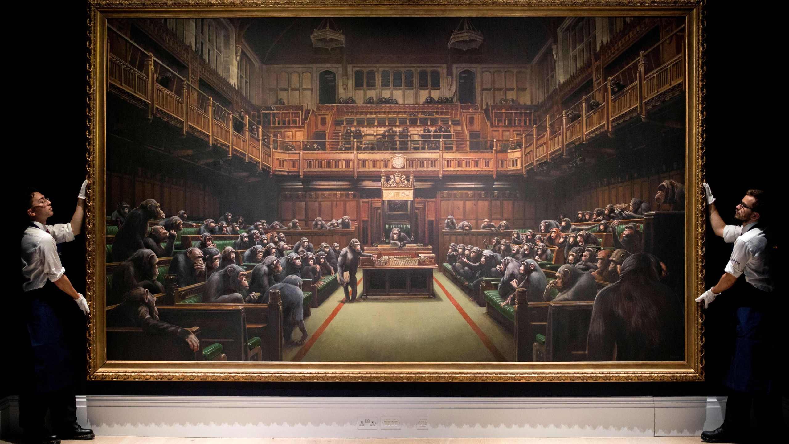 In 2009, Banksy created Devolved Parliament as a homage to the earlier work; and in 2019, upon the exhibition of Devolved Parliament ten years on from its execution, Banksy wryly declared on his Instagram account: “Laugh now, but one day no-one will be in charge”. Striking for its simple and raw immediacy, the power of Banksy’s work lies not only in its easy-accessibility and instant-gettability, but in his incisive wit and reliably anarchic and rebellious spirit. Commenting on the artist’s modus operandi, Patrick Potter has stated, “By laughing at the spectacle we undermine its power and make room for a bit of original thought” (Patrick Potter, Banksy: You are an acceptable level of threat and if you were not you would know about it, Durham 2012, n.p.).