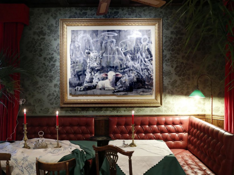 A Banksy installation hangs above the booths in the lobby at street artist Banksy’s newly opened Walled Off hotel in the Israeli occupied West Bank town of Bethlehem, on March 3, 2017.