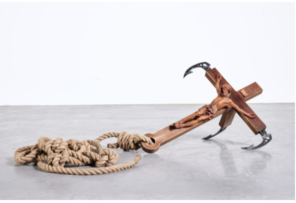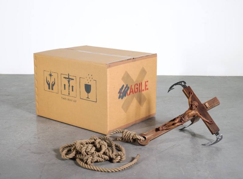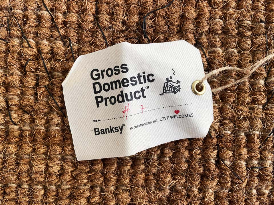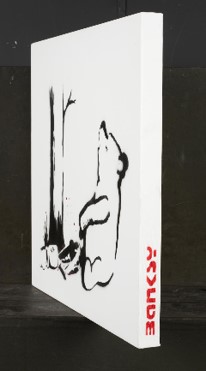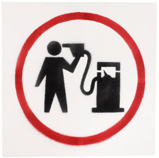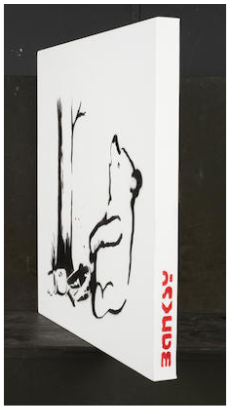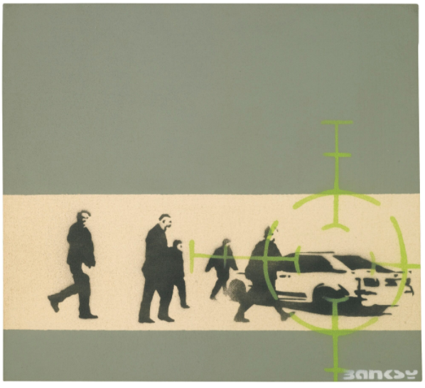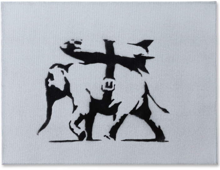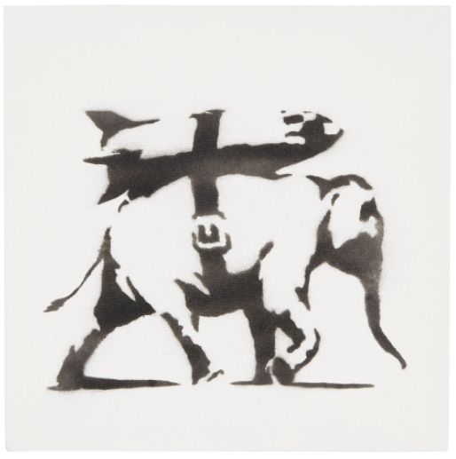 This version of Heavy Weaponry is filled with a variety of symbols and motifs that have recurred throughout the Bristol-born artist’s practice: an oversize barcode, his signature elephant backpacking a missile, and the names of the cities where the artist painted the most murals. The painting feels charged with a veiled anti-war sentiment, mocking the commoditization of military engagement.