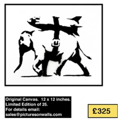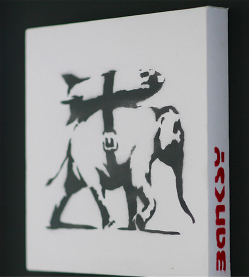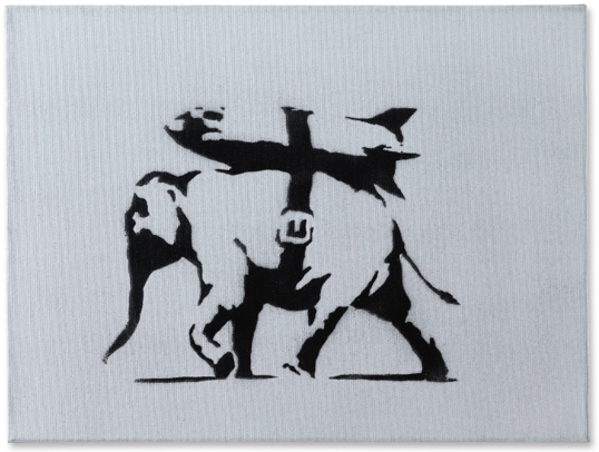 Heavy Weaponry depicts a singular elephant made in Banksy’s recognizable stencil style with a rocket strapped to its back. The image of the elephant bearing a rocket on its back carries various interpretations; presumably the general message is anti-military, in line with Banksy’s other works using similar imagery.