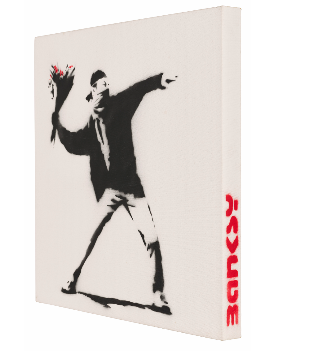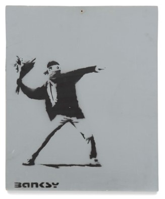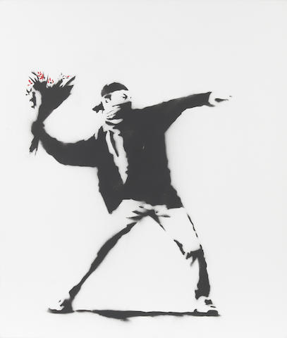 Standing among Banksy’s most celebrated images, Love is in the Air is an early iteration of his seminal ‘flower thrower’ motif. The work dates from 2002, three years before the seminal mural first appeared on the side of a garage near the newly-erected West Bank barrier wall. Offering a poignant response to the Israeli-Palestinian conflict, it was this image that cemented Banksy’s position on the international stage, establishing him both as an artist and as an activist. The masked insurrectionist—armed not with weaponry but rather with a floral bouquet—has since become a twenty-first-century icon, representing a universal image of peace and reconciliation. Over time, moreover, he has come to operate as an extension of Banksy himself, encapsulating the anonymous, non-violent insurgence that defines his urban interventions. Uniquely rendered using a hand-cut stencil and reproduced on the cover of his seminal 2005 book Wall and Piece, the work shares its title with the 1978 John Paul Young hit, injecting its message with a characteristic note of tongue-in-cheek wit. As the conflict continues—most recently escalating with a renewed outbreak of violence in 2021—the image endures like a beacon, offering hope to those across the world whose lives have been overturned by war.