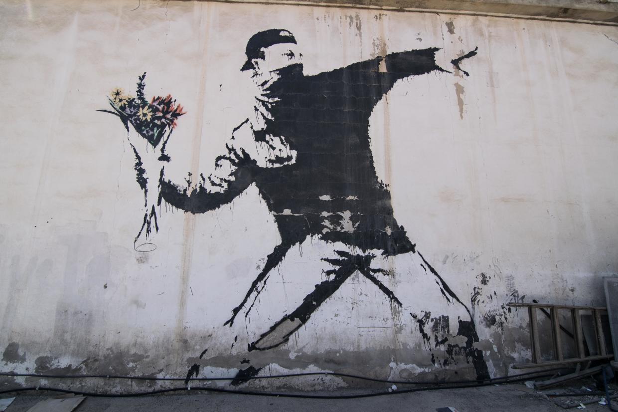 Since Love is in the Air, the West Bank barrier wall has become a site of particular focus for Banksy. Over the years, multiple works have sprung up in the region: notably his 2005 take on his iconic Girl with Balloon, depicting a young girl being lifted over the wall by a bunch of balloons. In 2017, Banksy designed the Walled Off Hotel with a view of the barrier, in an attempt to boost tourism in the area while simultaneously highlighting the ongoing conflict. The location of Love is in the Air, however—a town called Beit Sahour, just east of Bethlehem—holds deeper significance still. In Christian tradition, it is said to be the site of the Annunciation to the shepherds, which told them of the birth of Jesus. Interestingly, the pose of Banksy’s protagonist is perhaps reminiscent of the angel statue outside the town’s Shepherds’ Fields Chapel, whose arm similarly reaches into the distance. In Love is in the Air, Banksy makes a case for ongoing hope in a region that once bore tales of miracles and salvation, his protagonist pointing eternally towards the future.